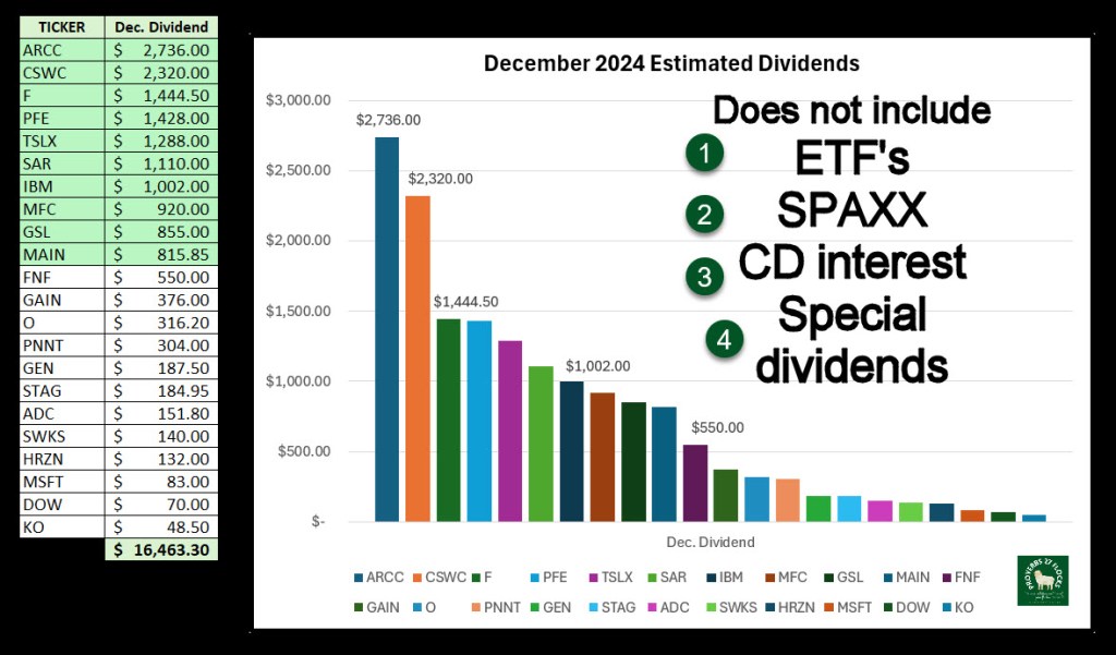 It is important to note that this graph does not include unannounced ETFs like VYM, SCHD, DTD, and DGRO. It also doesn’t show income from SPAXX, CDs, or any special dividends. ETFs tend to declare their dividends for the quarter close to the end of the month. For example, the Ex-Dividend date for VYM in December 2023 was 12/18/2023. This was probably announced the day before that date.