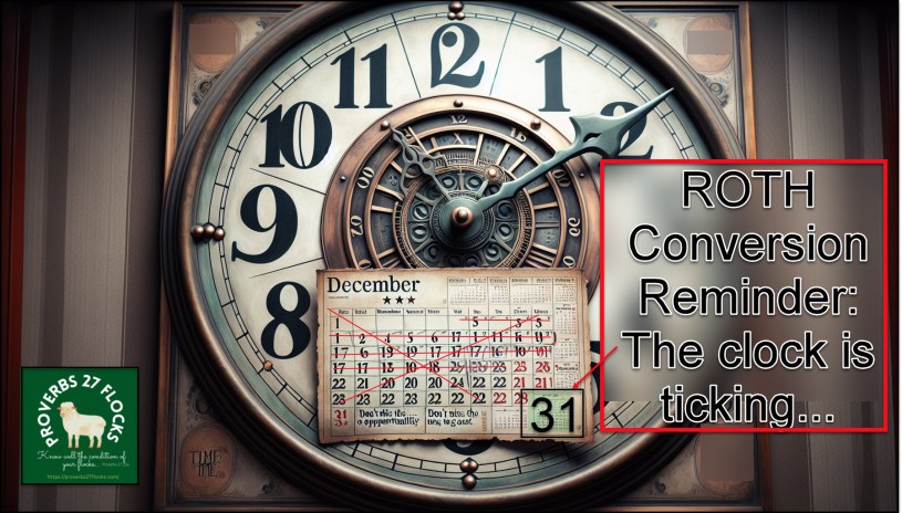 Some people are procrastinators and postpone decisions and actions. This is a reminder that some investment decisions can wait until January or even April, when it comes to your traditional IRA or ROTH IRA. But there are some actions you may want to take now rather than later. In my case, the window of opportunity is quickly coming to an end to maximize our 2024 ROTH conversions.