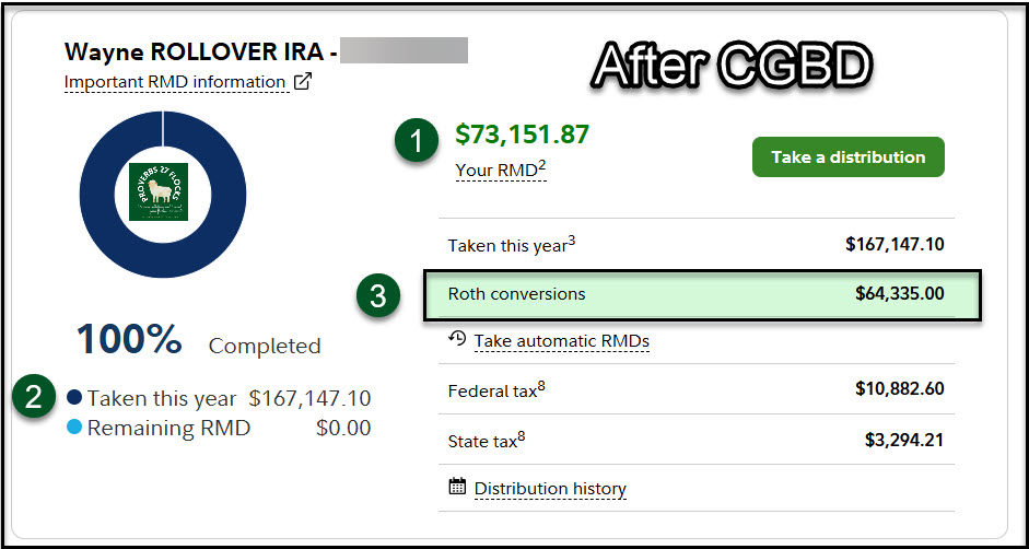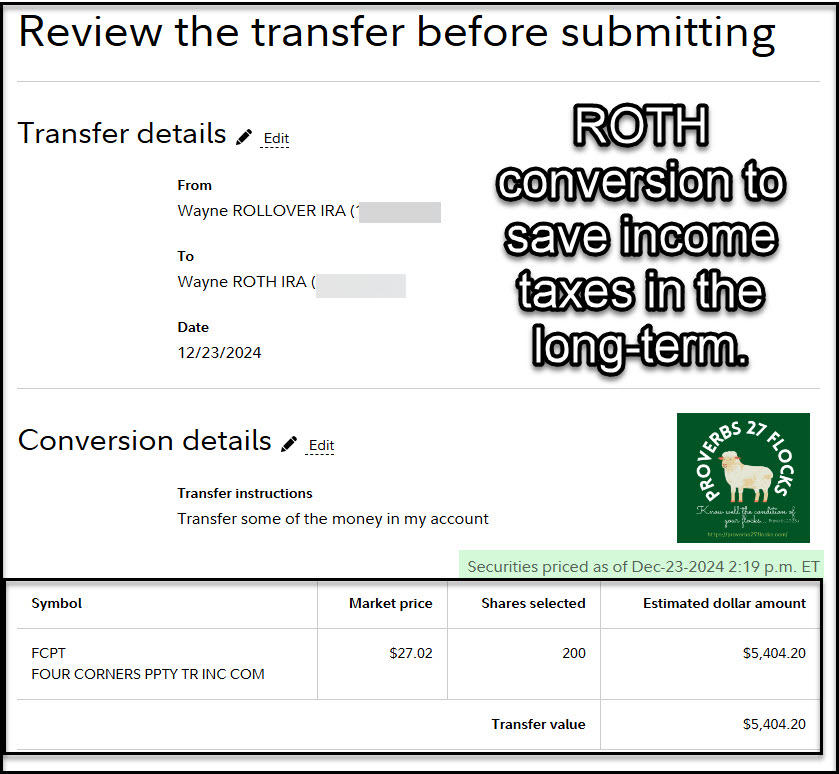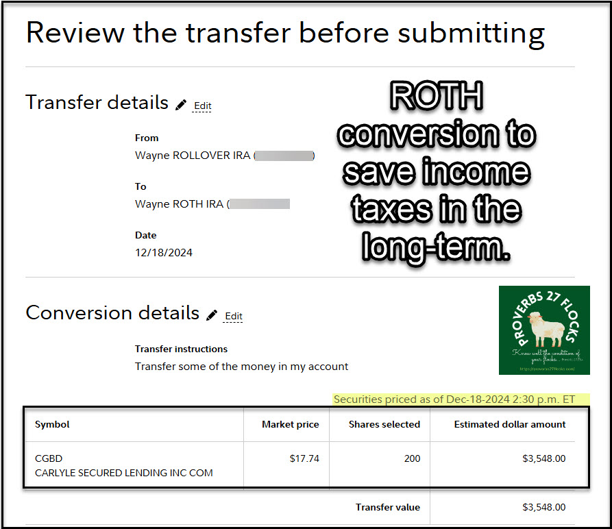 My two most recent conversions were for shares of CGBD and FCPT. Both pay a dividend. The total taxable portion of this ROTH conversion was about $9,000. Therefore, we owe income taxes on that amount.
