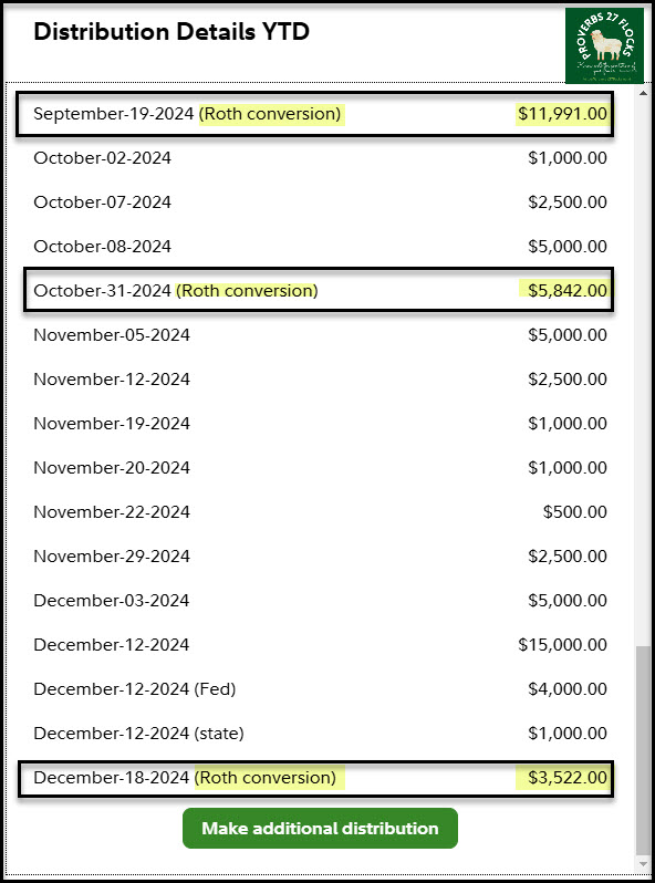 I completed my RMD withdrawals earlier this year using QCD withdrawals and some cash withdrawals from my IRA. Cindie did the same for her IRA. Therefore, even though I will exceed the base Medicare amount due to IRMAA, I plan to do extra ROTH conversions before December 31.