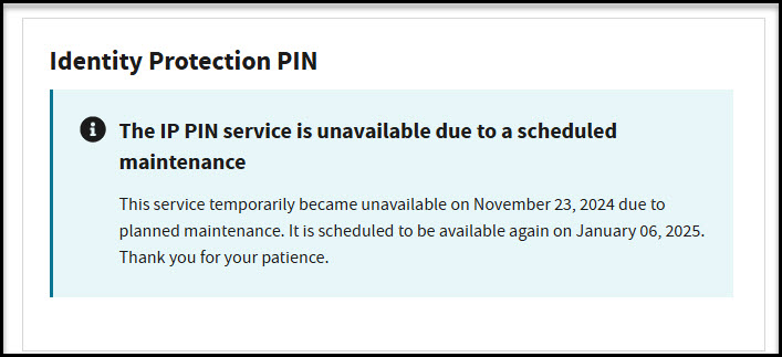 When I tried to get my 2025 PIN I learned near the end of the process that the IP PIN service is unavailable due to scheduled maintenance. That doesn’t prevent you from getting signed up on ID.me, but you won’t be able to get your PIN until January 6.
