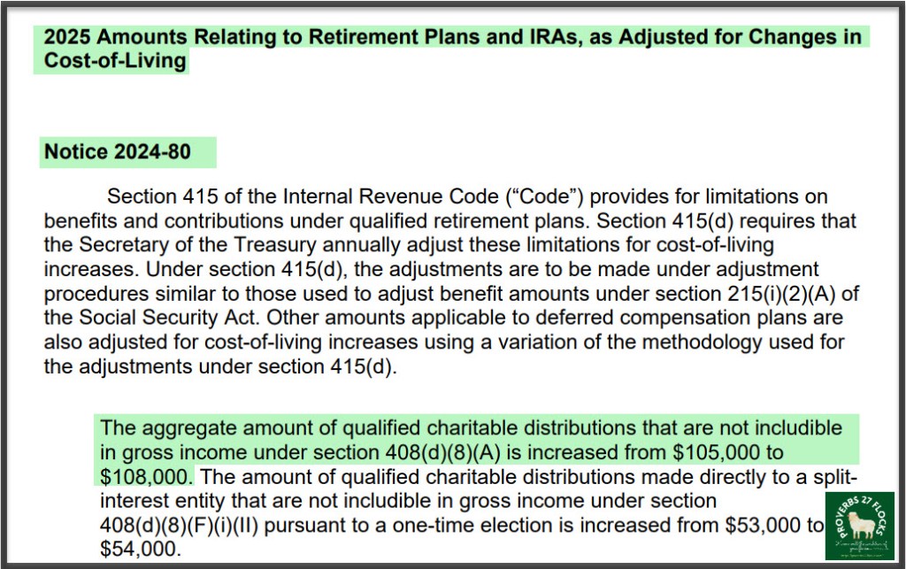 Therefore, the goal, if God permits, is for us to hit the $108K limit of giving using direct payments from my traditional IRA. The other goals will be announced in future posts.
