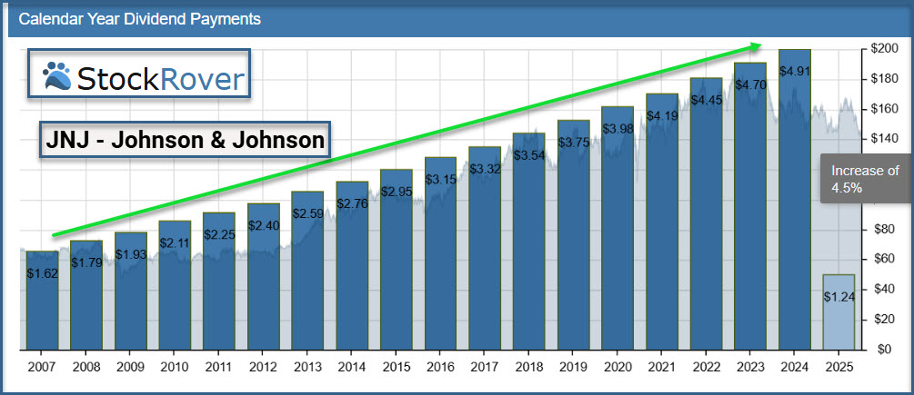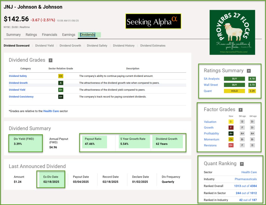There are a couple of reasons I bought shares today. First of all the dividend growth is very good. Secondly, I can trade covered call options on my shares. JNJ will soon be announcing earnings, and I am optimistic about a positive report. Finally, JNJ’s ex-dividend date is just around the corner.