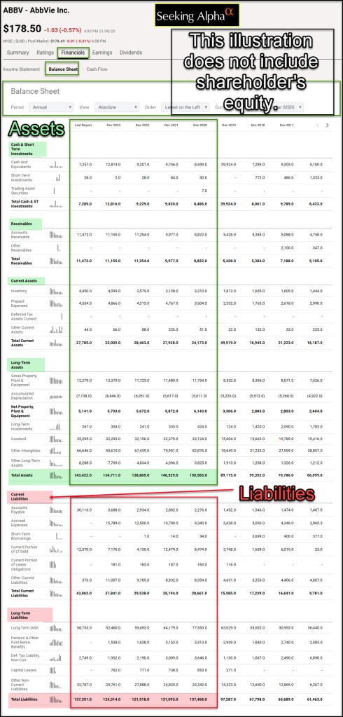 It is easy to see the balance sheet for any company by using Seeking Alpha. Here is an image that shows some of the balance sheet information for Abbvie. As you can see, there is a lot of information. I only look at this in very rare circumstances. I’m more interested in profitability and the growth of the business and the rational growth of the dividend.