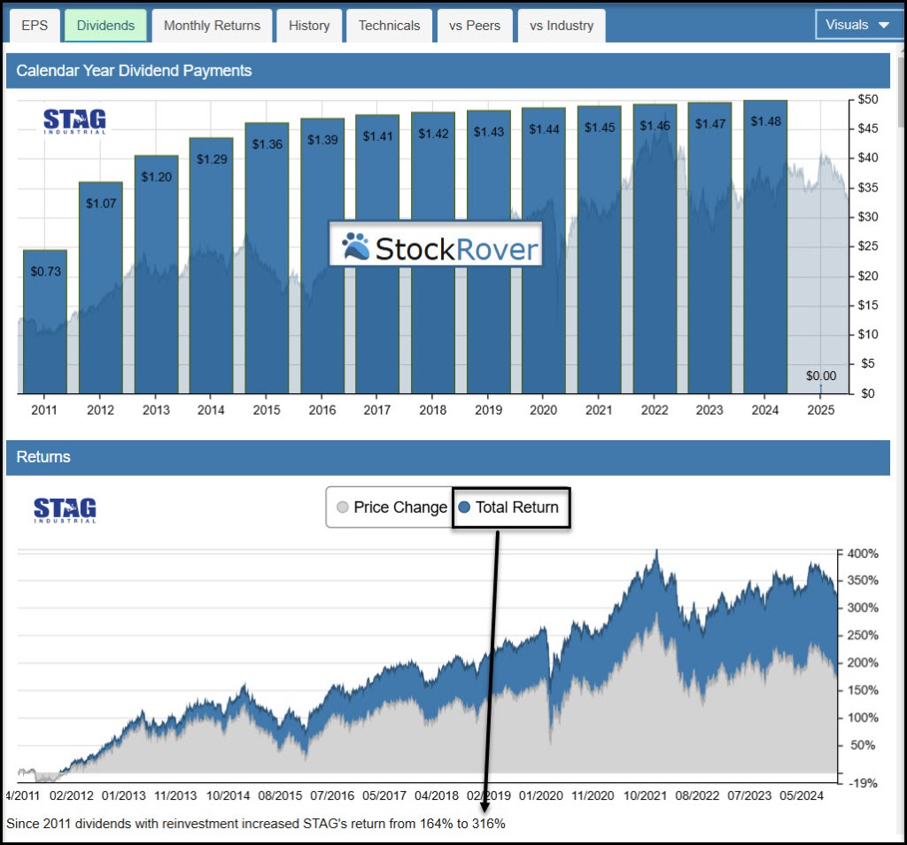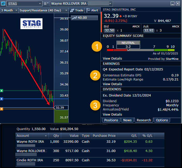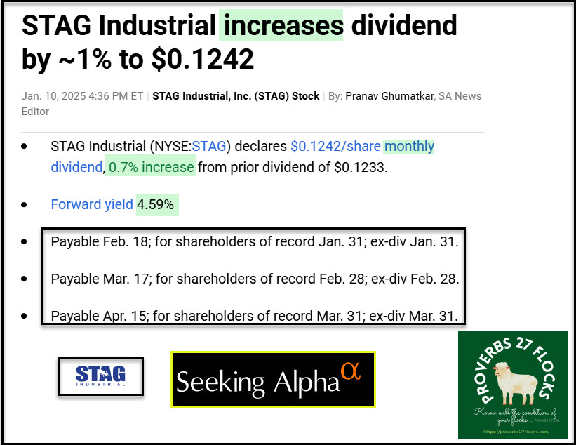 We currently own 1,550 shares of STAG. I strategically moved shares of STAG from my traditional IRA to my ROTH during 2024. That increases our monthly tax-free income. Even though STAG has seen pricing pressure, the fundamentals of the business are good.