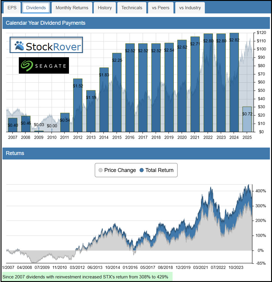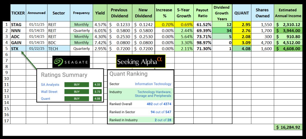 I am keeping track of dividend announcements for each position in our portfolio. STX announced a regular quarterly dividend of $0.72 per share. Here is the update from my spreadsheet.