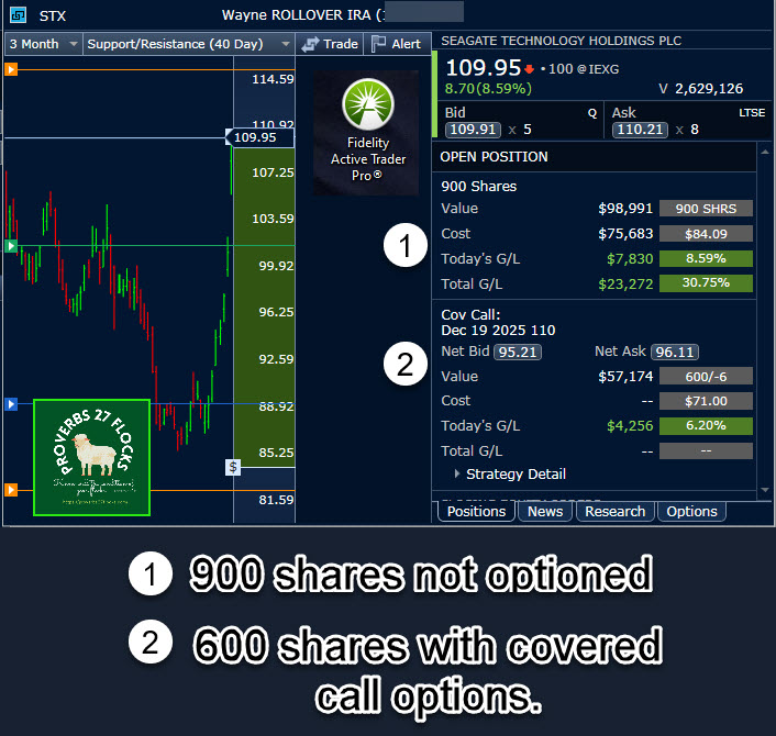 A view of stocks and options within each individual account. This image shows the 900 shares I have that are not currently covered by an option contract and the 600 shares that are part of an option contract. In my traditional IRA I hold 1,500 shares of STX.
