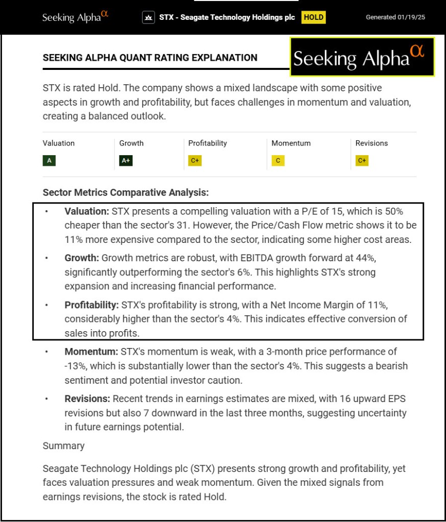 One nice feature of the Seeking Alpha subscription in the “Virtual Analyst Report” that is shown as an orange box next to the company symbol and name. Here is a portion of the report for STX.