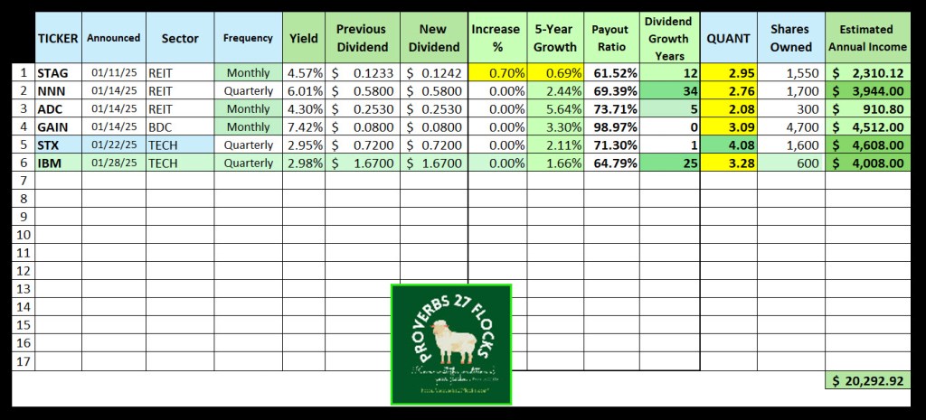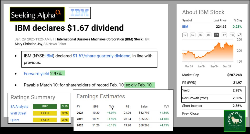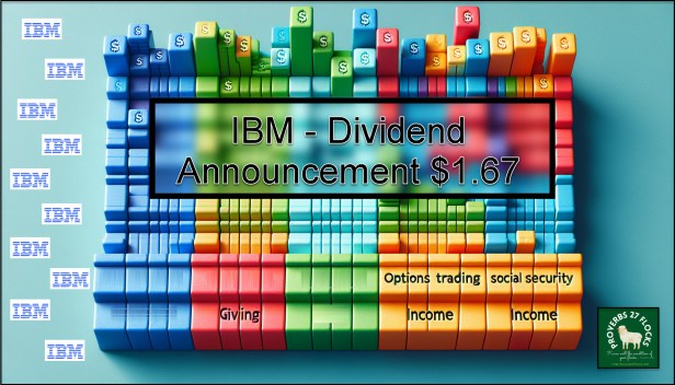 I am keeping track of dividend announcements for each position in our portfolio. IBM just announced a regular quarterly dividend of $1.67 per share. Here is the update from my spreadsheet.
