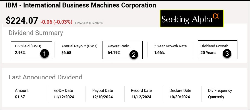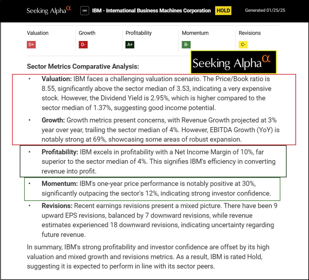 One nice feature of the Seeking Alpha subscription in the “Virtual Analyst Report” that is shown as an orange box next to the company symbol and name. Here is a portion of the report for IBM.