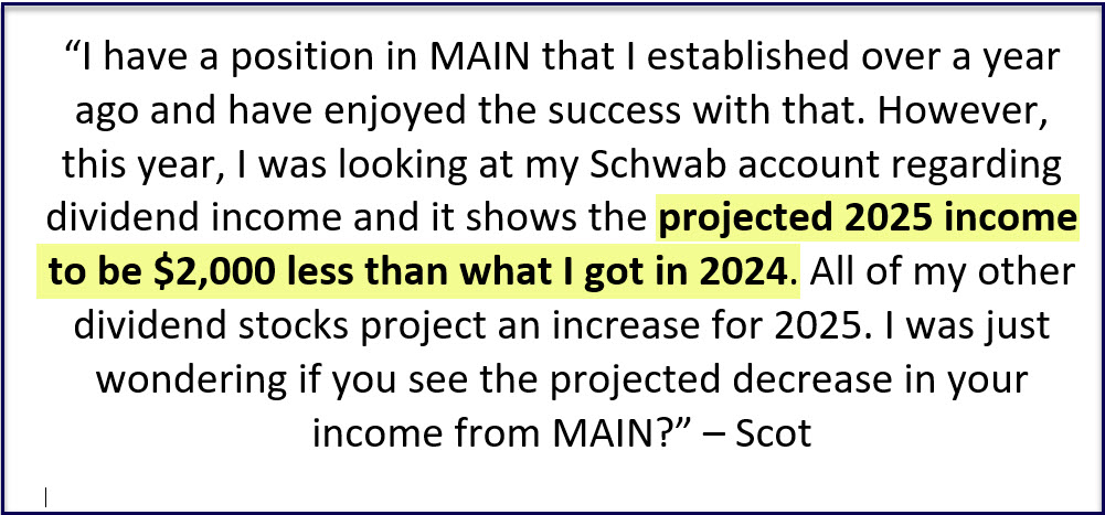 “I have a position in MAIN that I established over a year ago and have enjoyed the success with that. However, this year, I was looking at my Schwab account regarding dividend income and it shows the projected 2025 income to be $2,000 less than what I got in 2024. All of my other dividend stocks project an increase for 2025. I was just wondering if you see the projected decrease in your income from MAIN?” – Scot