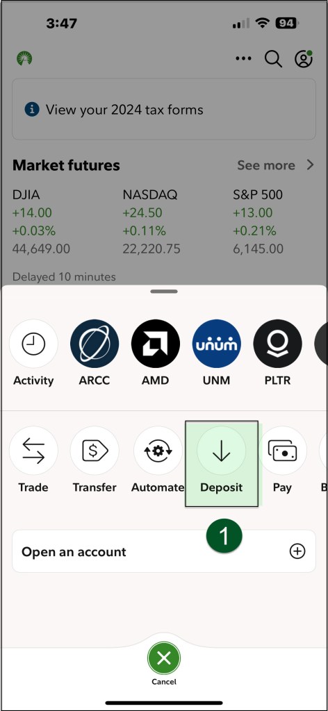 Although I do not use the Fidelity iPhone app for buying or selling investments, it is a place where I can quickly see some information that can be useful when traveling. It also has a feature to deposit checks, although I recently learned from a friend that Fidelity has a $1,000 limit for deposits using that functionality. (That seems odd to me.)