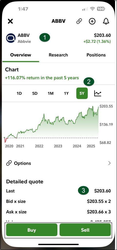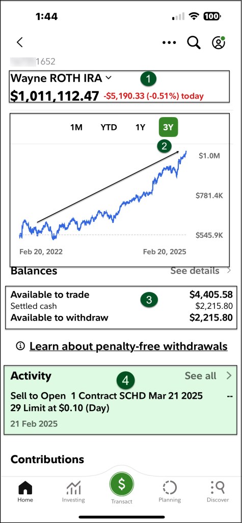 This image shows me a number of helpful reminders. It tells me how much cash is available in my ROTH account for trades (3). When I took this screen image I had just traded a covered call option on 100 shares of my SCHD ETF shares in my ROTH IRA (4).