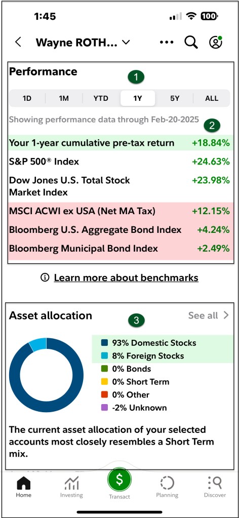 Asset allocation also matters because your allocation will impact your returns. This same image from my iPhone shows that I have 93% of my ROTH assets in US stocks and another 8% in foreign stocks. (This is obviously incorrect because this means I have 101% invested in the market.) However, the “Unknown” is negative 2% in an attempt to make the numbers rational.