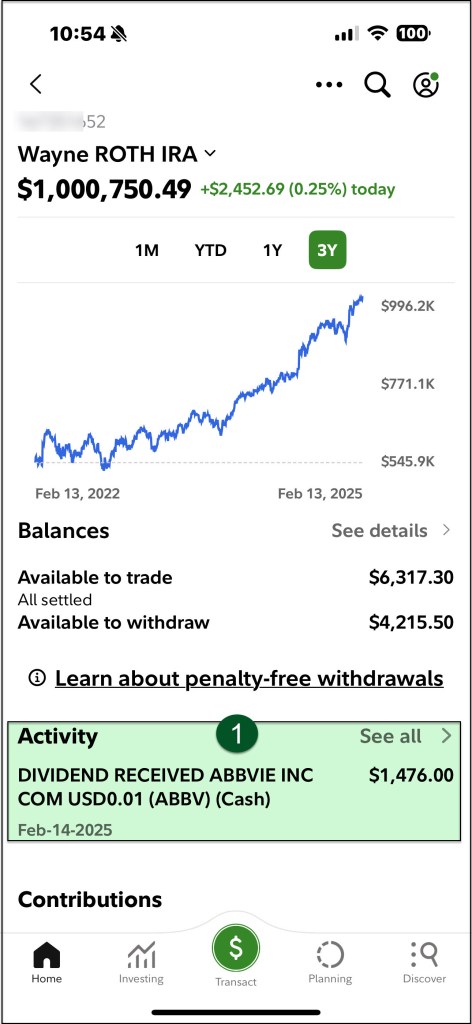 It is helpful to look at a graph. In this image I can see the growth of my ROTH IRA over the last three years. Some of this is the result of ROTH conversions, but I did not reach $1M just by converting assets from my traditional IRA. This image also reminds me that $1,476 of dividend income was posted to my ROTH IRA account.