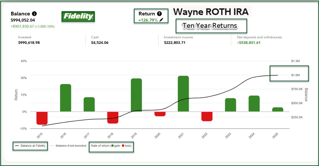 The following screen shots from Fidelity show just my ROTH IRA. The ROTH account is smaller in total dollars than my traditional IRA, but I hope someday to reverse that by continuing to roll investments from my IRA to my ROTH.