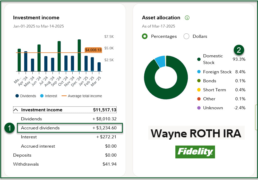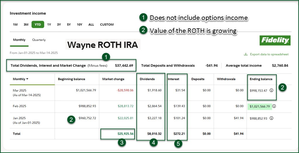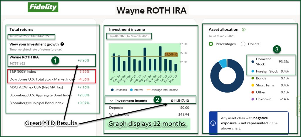 For 2025 my ROTH account has given me $8,234.49 in dividend income (including dividends that were received this morning.) I have also gained $17,140.81 in options income without having to sell any of my shares traded using options. In addition, because I participate in Fidelity’s “Fully Paid Lending Program” I have received an additional $248.93 in interest from my shares on loan. Finally, and much to my surprise, I am beating the S&P 500 index YTD. This is due to my smaller exposure to big tech names that have been hammered by market fearfulness.
