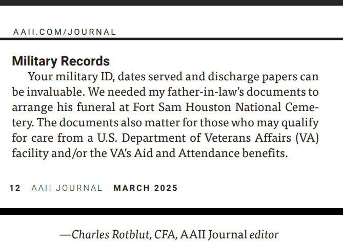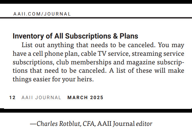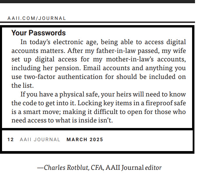 I recently read a two-page article in the current issue of the AAII Journal. The title of the article was “Key Financial and Estate Planning Steps for Aging Parents and Children.” It was written by Charles Rotblut, the AAII Journal editor. Three sections were things I wanted to tackle sooner rather than later. The first section covers passwords. Passwords are needed because there is evil around us, within us, and the wicked of this world like to steal.