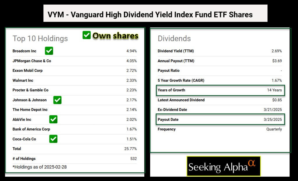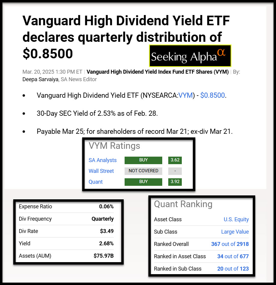 When an ETF announces a dividend I compare the dividend with the same quarter’s dividend from the previous year. This year, for Q1, VYM did not disappoint. The distribution is well above Q1 of 2024. We will see the dividend in our accounts on March 25. VYM is one of our top five investments.