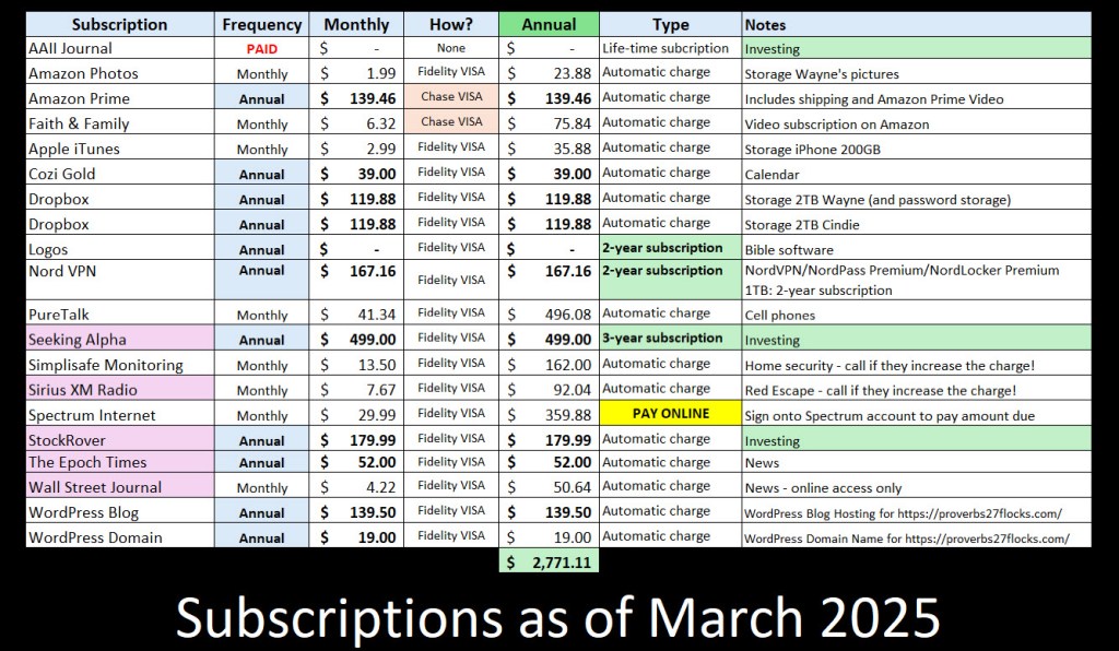 If I didn’t miss a subscription, then our total cost is about $2,771 per year. Given the total of our expenses, that isn’t a huge amount. However, it pays to keep costs under control. I suspect that most people have no idea what they spend in total for subscriptions and services.