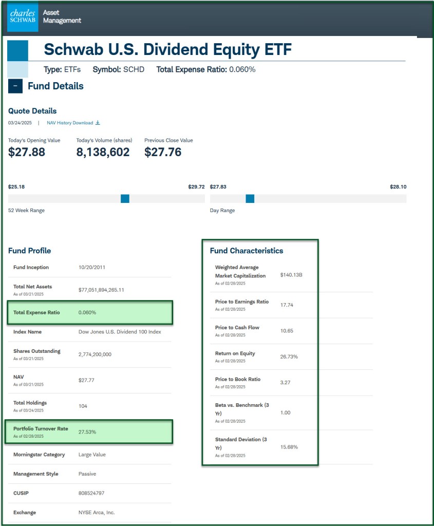 I prefer to invest in funds that have a more moderate approach. Therefore, SCHD’s turnover ratio of 27.53% is appealing. Of course, this assumes that the fund manager sold the underperforming assets (or assets that now have a P/E ratio that is irrational) and purchased replacement investments that have more growth and dividend growth potential.