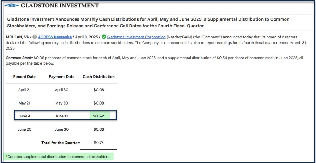 We own 4,700 shares. Therefore, the supplemental dividend of $0.54 per share is an additional bonus dividend income of $2,538. While supplemental dividends are nice to have, don’t depend on them as a regular occurrence. However, the monthly dividend of $0.08 per share is worth $376 every month. That is a dividend that is reasonably dependable based on GAIN’s history of dividend payments.