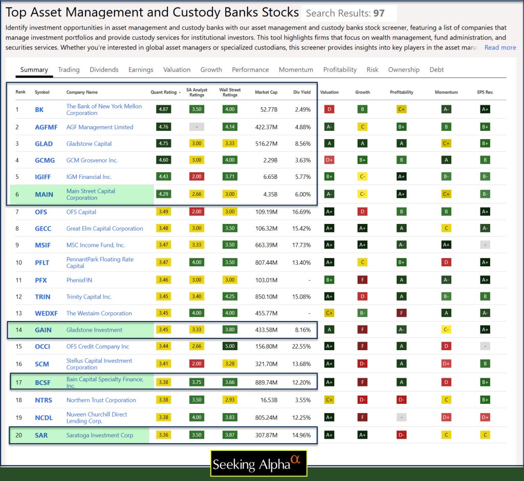 Using Seeking Alpha is one way to find similar investments. I like to review the BDC investments by Seeking Alpha’s QUANT rating. In the top 20 “Asset Management and Custody Banks” we own four: MAIN, GAIN, BCSF, and SAR. MAIN is our largest holding in the BDC space at the present time.