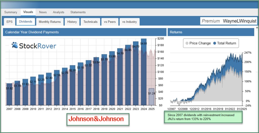 It doesn’t hurt to get a “second opinion.” I often go to StockRover for that perspective. Here are two screen shots that help substantiate the value of owning JNJ. (I have a “Premium” StockRover subscription.)
