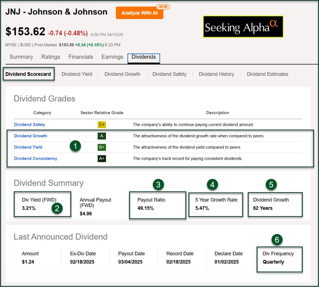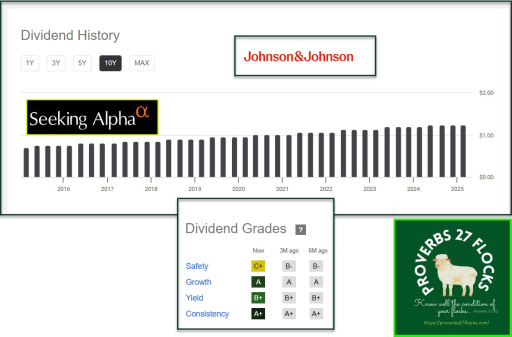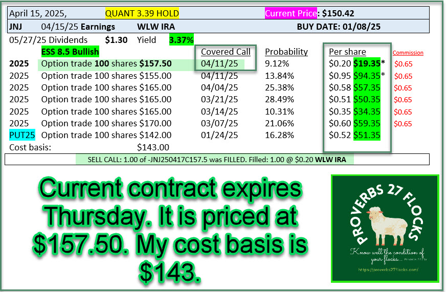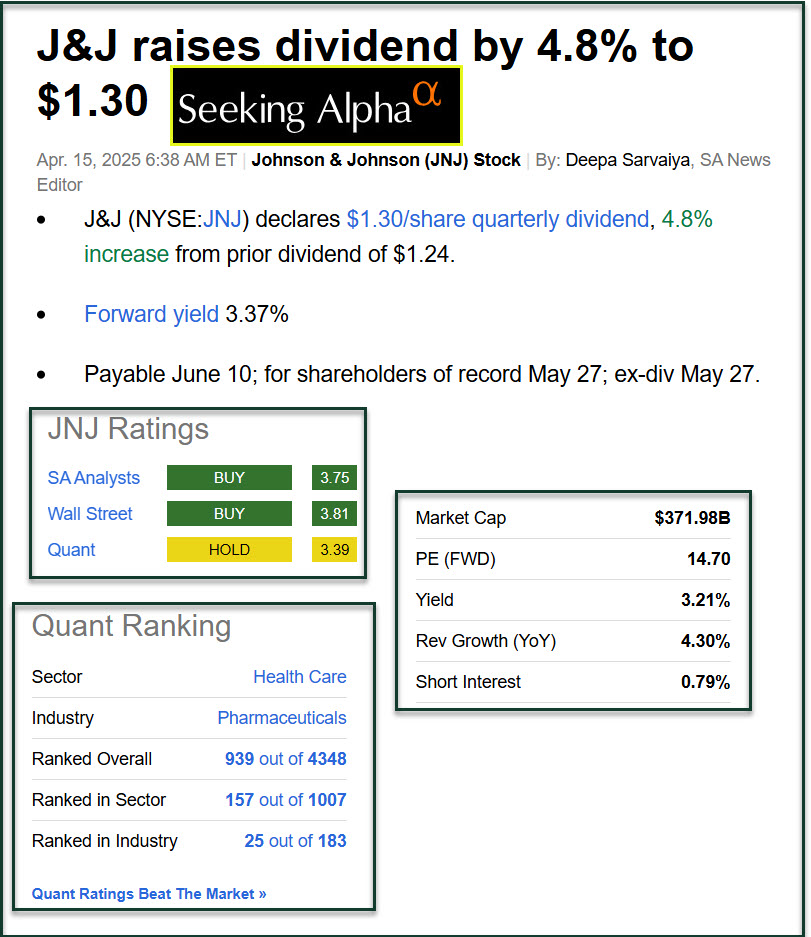 Finally, as you would expect, I look at Seeking Alpha before buying or selling an investment. JNJ has a very, very long history of paying increasing dividends. The payout ratio is perfect: 49.15%, and the yield is a decent 3.21%. Bear in mind that my “yield” is greater than that due to options trades.