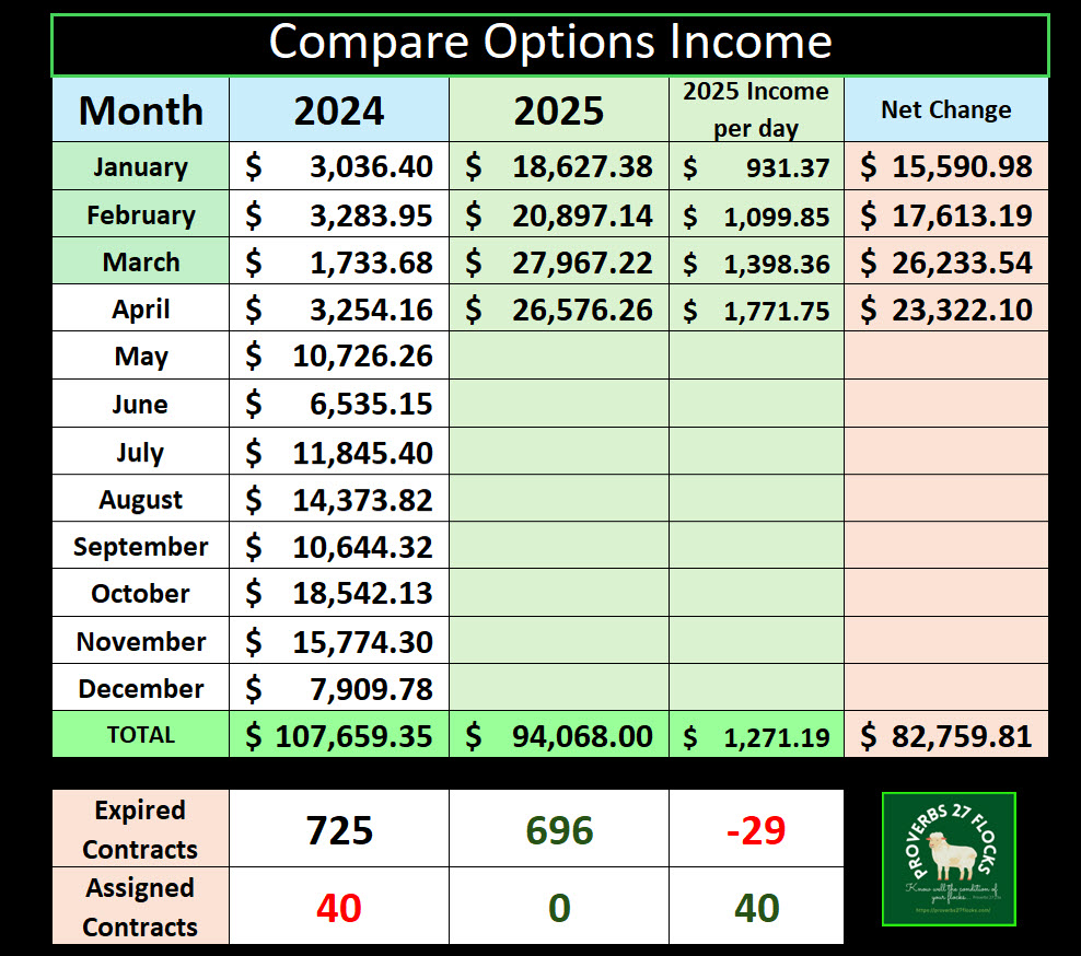 Even though April has been a “bad” month, options income has been far better than I would have expected. April MTD options income is $26,576 compared to April 2024 options income of $3,254. Next week I would not be surprised if we hit $100K in options income for January-April 2025.
