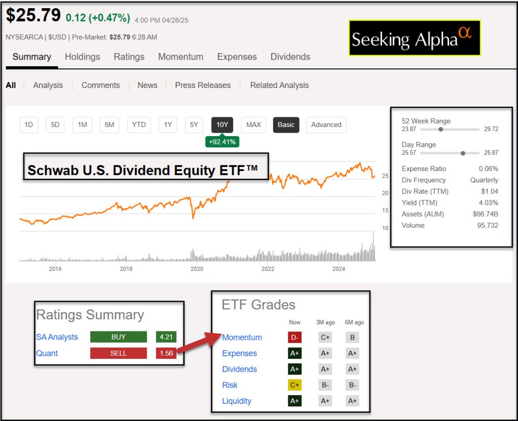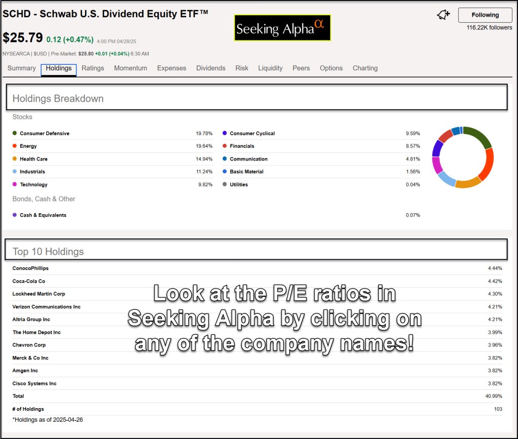 If you were to look at the P/E ratios of the top ten investments in ETF SCHD, you would see they are much lower than both of those values.