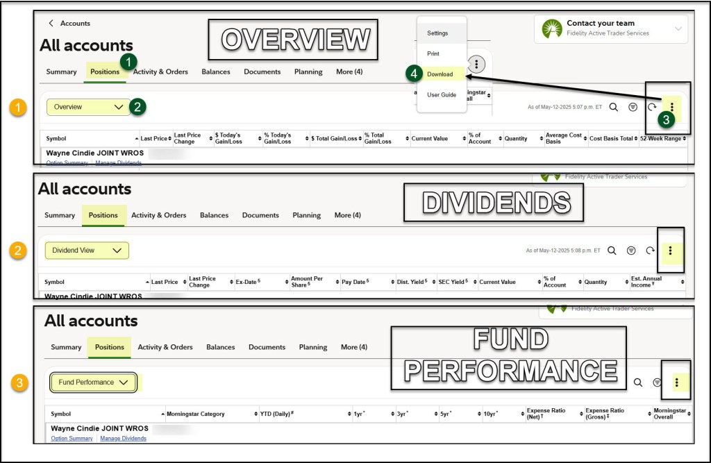 If you are on your “All Accounts” page when signed onto Fidelity, click on the “Positions” tab. Then, notice the box that says “Overview.” That is the first place you should look. If you look on the far right side of the page you will see three dots.