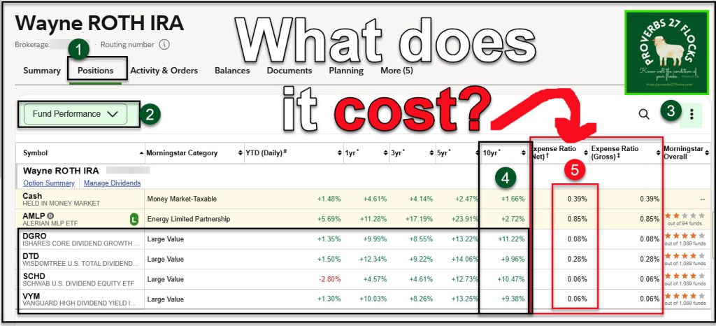 Finally, everyone should then switch from the “Dividend View” to the “Fund Performance” view. This tells a story about how expensive your holdings are. Mutual funds can be a real drain on your long-term success and results.