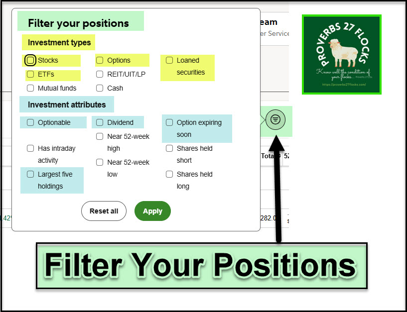 Before I forget, there is one other feature in the Positions tab. I don’t find it very useful for most things, but it might prove useful at times. You can filter your positions by various attributes. I tried some of them just to see what they would display.