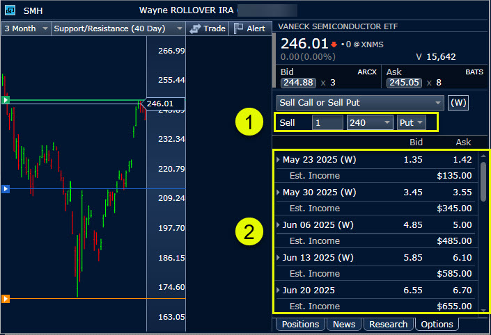 Another plus SMH for options traders: It is possible to trade weekly covered call options and cash covered put options on SMH, so that is a rare plus for most ETFs I have seen. Of course you need 100 shares to trade one cc option. Here are some images from Fidelity’s Active Trader Pro. If I ever sell some of my AVGO shares, I will probably replace them with SMH shares.