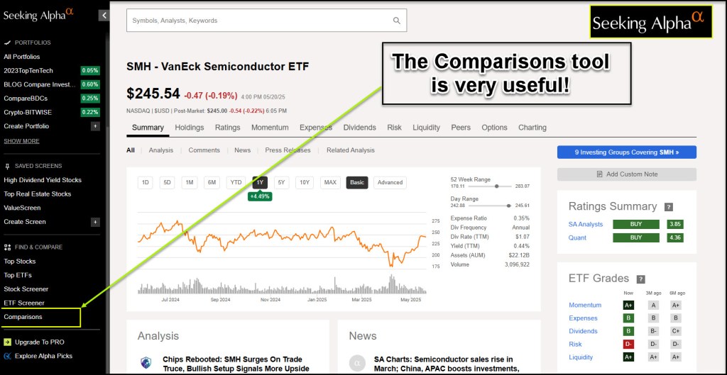 One great advantage of the Seeking Alpha website is their comparison tool. I used this tool to create the following spreadsheet image. After entering the ten ticker symbols of SMH’s largest holdings I was able to save the results to an Excel spreadsheet. That way it is easy to look at how each holding within SMH compares. The second image shows where you can find the comparison tool.