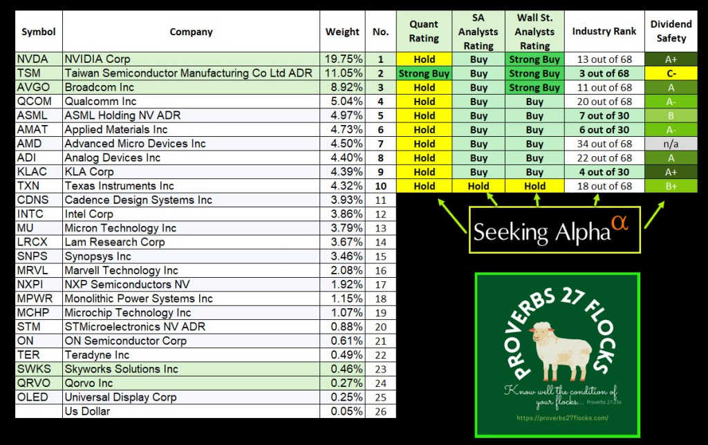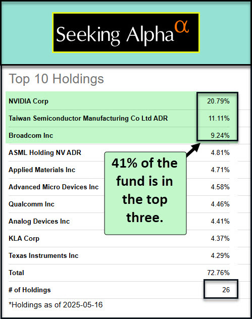 Interesting ETF with a nice mix of Semiconductor companies. We own shares of the top three (NVDA, TSM, AVGO), which is a huge chunk of the total. AVGO is one of my top ten holdings.