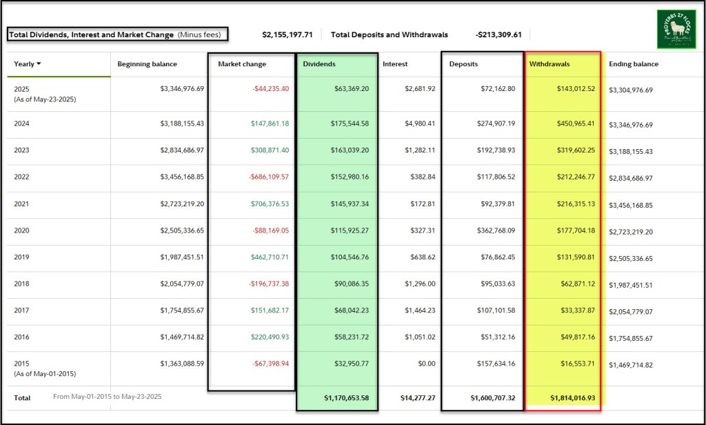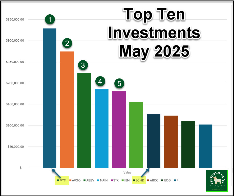 You can see this in my list of our top ten investments. VYM and SCHD are ETFs. VYM is our largest investment. However, we also own shares of AVGO, ABBV, MAIN, STX, IBM, ARCC, EOG and F in our top ten.