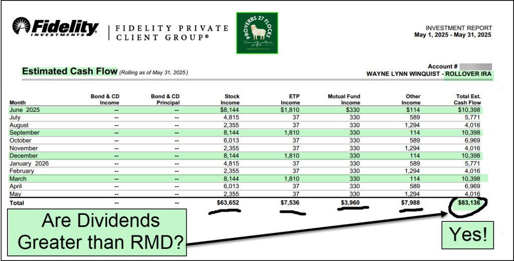 The other thing Fidelity does well is presenting a rolling twelve month “Estimated Cash Flow.” In the following three images for our three largest accounts, you can see the EAI for my traditional IRA is $83K for the next twelve months. That covers my RMD so I won’t have to sell any investments to satisfy my RMD.
