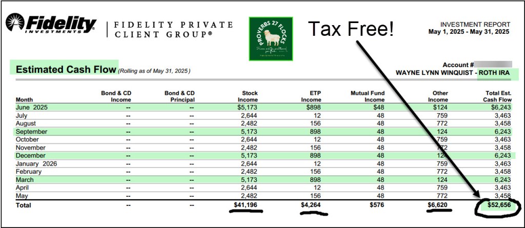My ROTH IRA has estimated cash flow of $52.6K. Again, if you look at the months you can see that Fidelity is not able to forecast dividend increases, and they assume you won’t be buying or selling any investments. However, it is a good rough estimate.