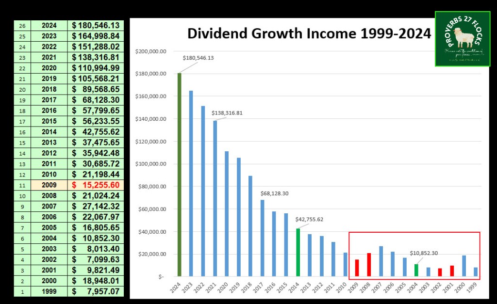 After you have four or five years of statements, it is easy to see what your dividend growth looks like. Take the last statement of the year and look at your total dividend and interest income. Then compare the changes each year. In the following example I took all of our statements from 1999-2024 and created a table and a graph using Excel. This makes it easy to see the dividend growth in dollars and the percentage change each year.