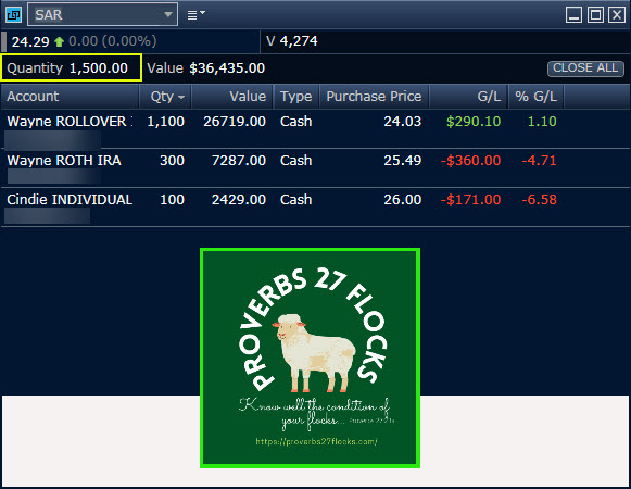 Because we own 1,500 shares of SAR, we will receive $375 per month in dividends on the following dates: July 24, August 21, and September 24.