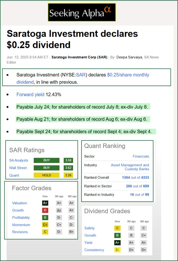 The final dividend grade is called “Consistency.” Consistent dividends are like a consistent Social Security payment. You want consistency. SAR’s current grade is C-. It had been D+ and six months ago it was D+. I don’t believe there is risk associated with a dividend cut. However, the current QUANT rating is a HOLD at 3.26.