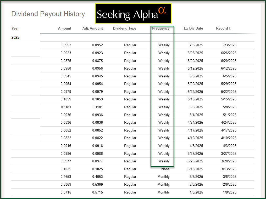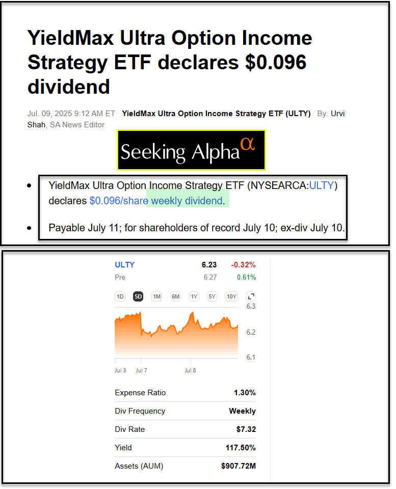 Based on my purchase, I will be receiving the next weekly dividend. YieldMax Ultra Option Income Strategy ETF (ULTY) declared a $0.096/share weekly dividend. The dividend I will receive is $9.60. That is crazy. If the next 52 weeks of dividends is at least $0.09 per share, the income will be $4.68 per share or $468 for a year.