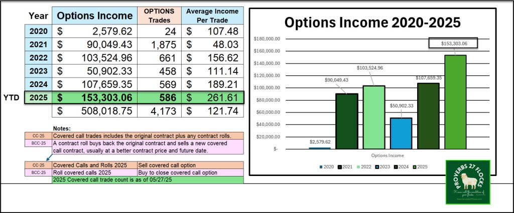 The first half of 2025 has been amazing. Even though the year is only half over, I have already exceeded the total options income for each of the preceding five years. Even more amazing, none of my options have been called. That means I have (so far in 2025) not lost any of my shares do to having the strike price rise to the contract price by the contract expiration date.