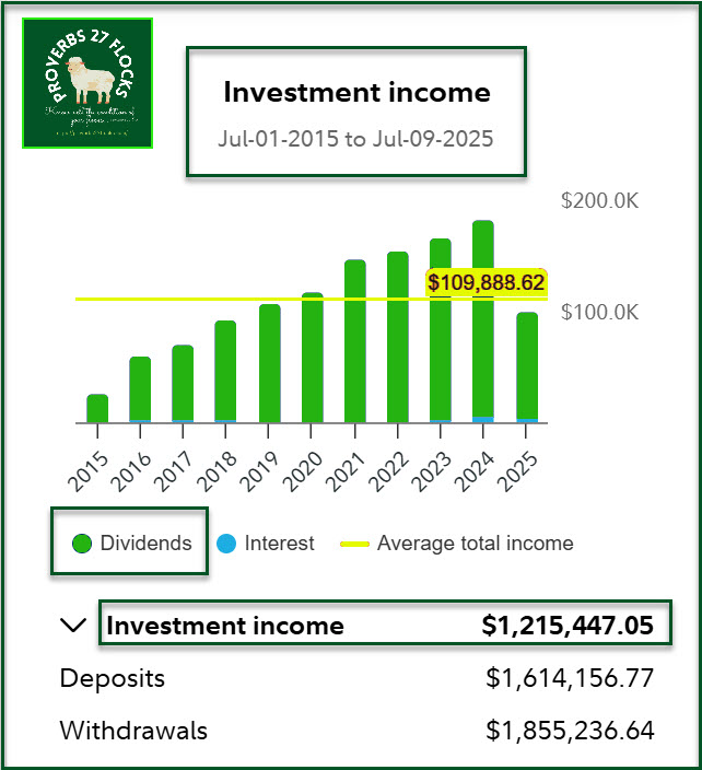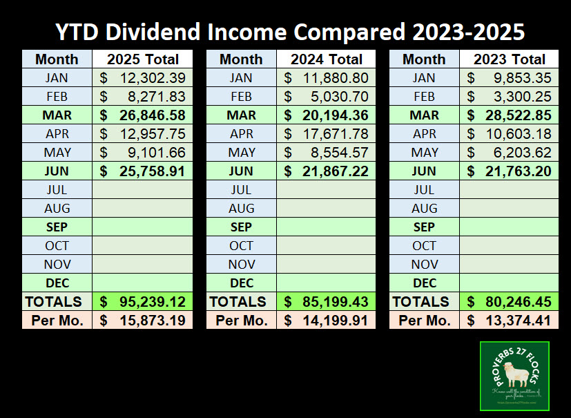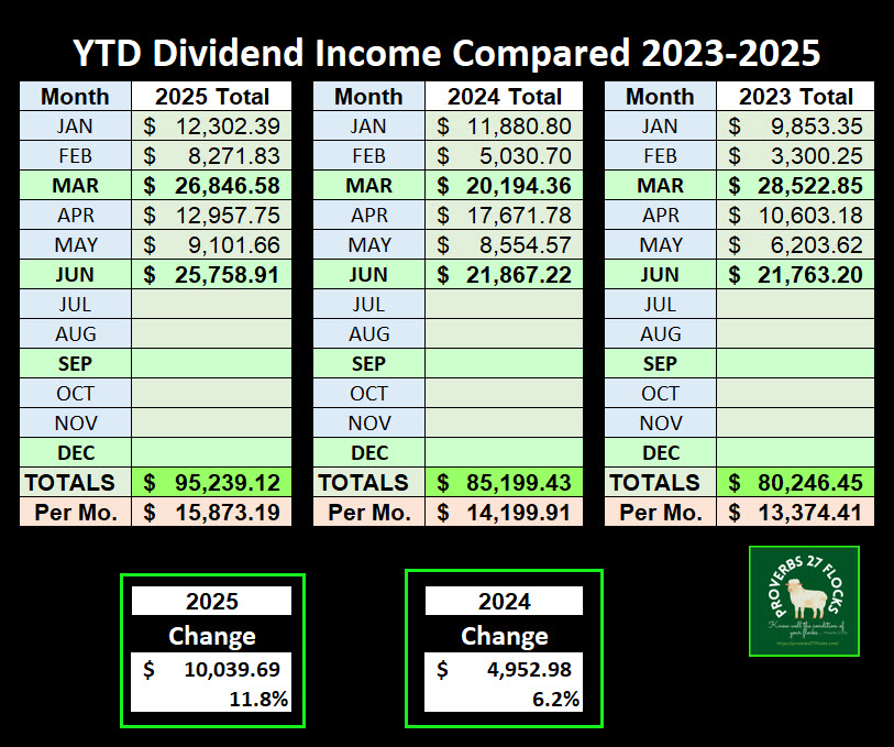 The thing I am looking for is year-over-year, quarter-by-quarter growth. For Q1-Q2 for the six months in question, 2025 continues with a positive gain over the previous two years. This was accomplished without adding significant dollars from outside of the accounts. Most of the investment buys were funded with incoming dividends or with earnings from trading options.