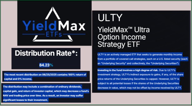 Investing in the fund involves a high degree of risk. Due to ULTY’s investment strategy, ULTY’s indirect exposure to gains, if any, of the share price returns of the Underlying Securities is capped. However, ULTY is subject to all potential losses if the shares of the Underlying Securities decrease in value, which may not be offset by income received by ULTY.