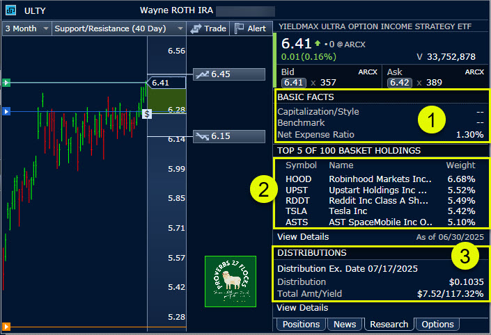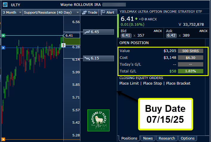 Since my first purchase of 100 ULTY shares in my ROTH IRA on July 8, I have added 100 more shares to my ROTH IRA and purchased 500 shares in my Traditional IRA. My average cost basis now stands at $6.28 per share. My total investment is $4,399. To put this in perspective, the total value of my IRA and ROTH is $2.9M, so my ULTY investment is 0.15% of my total retirement assets.