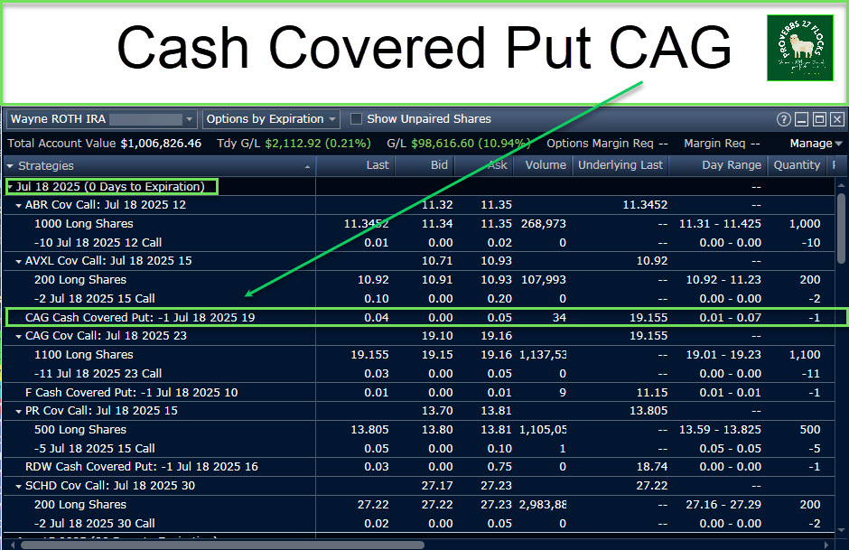 A cash covered put is a different type of options contract. It says “I am willing to buy your shares if they fall to a price I am willing to pay.” If the shares of XYZ are currently selling for $25 per share, and the owners of the shares are nervous that the price might decline, I can do a “sell” that sounds like this: YOU SOLD OPENING TRANSACTION PUT (XYZ) THE XYZ COMPANY AUG 15 25 $23.