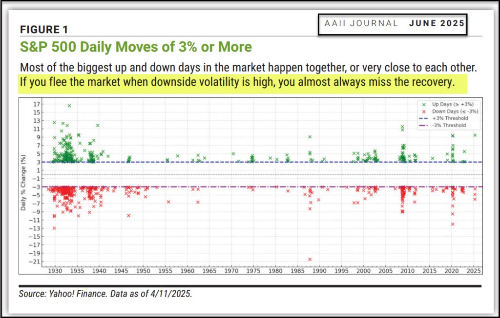 “A volatile stock, market or other financial instrument is one that incurs a big change in its value over a short period of time. The change in value can either represent a gain (upside volatility) or a loss (downside volatility). The value can also swing back and forth in a significant manner—just like the S&P 500 has done so far in 2025. Volatility is tied to risk because large downward price moves can result in a shortfall when withdrawals need to be taken. Sudden, sharp drops also unnerve investors. Evolution has made humans averse to losses.” AAII